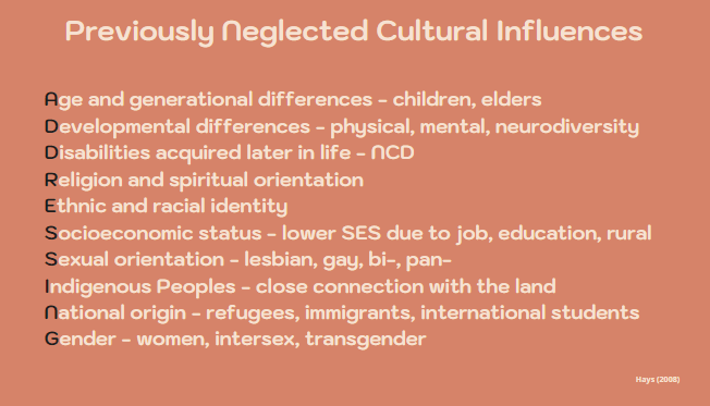 Hays, P.A. (2008). Addressing cultural complexities in practice: Assessment, diagnosis and therapy (2nd ed). American Psychological Association.